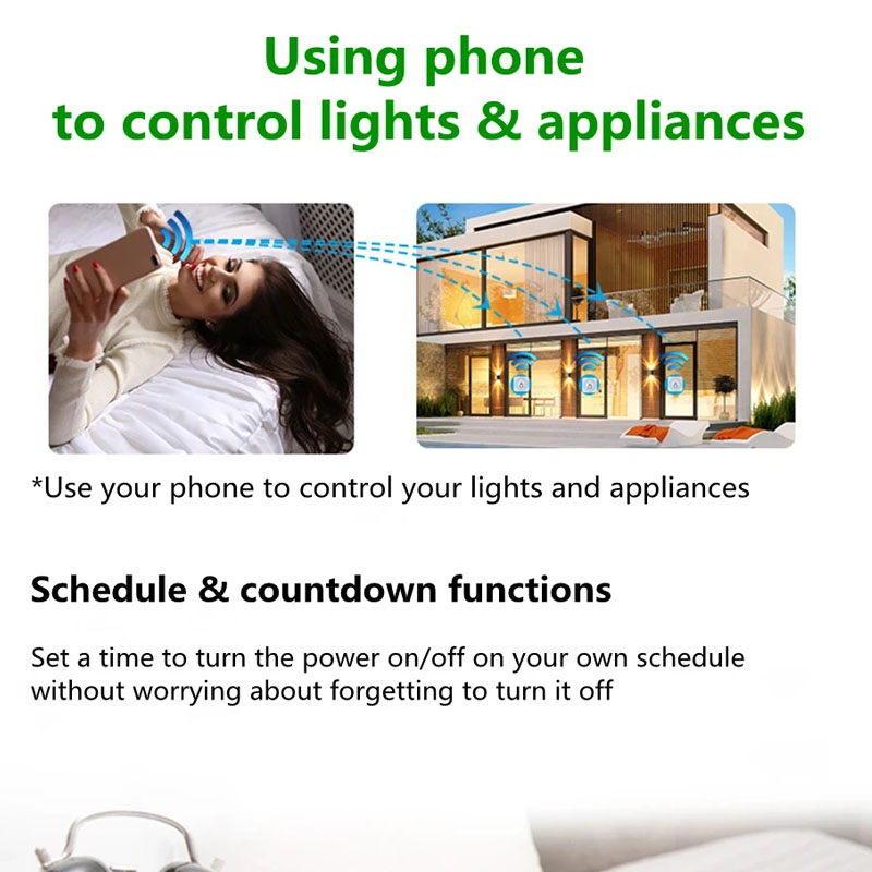 5. 【Timing control】You can control the switch, timing, countdown and other functions of the device through your mobile phone. This can be ordered: turn off the lights in the living room after 2 hours. 18:15 Turn off the oven. Turn on the boiler at 21:00. You can also time the device when you are not at home. (APP: Smart Life/TUYA Smart)